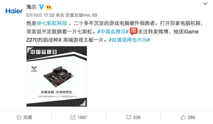 海爾對于幫其他品牌打廣告這件事態度也很開放。國家品牌日當別人家都在為自己打廣告的時候,海爾官微開放廣告位,為其他企業打廣告。
